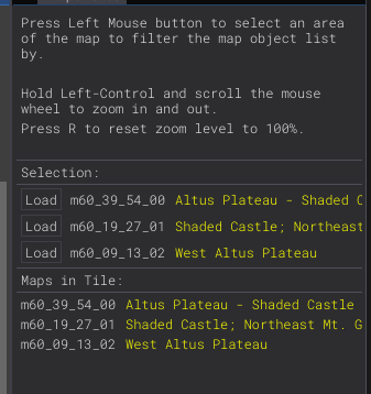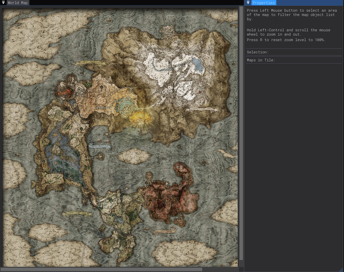 The world map is a visual window for selecting a map group by clicking on it within the Base or Shadow of the Erdtree maps. This makes it much easier to find the map tiles you want to edit.